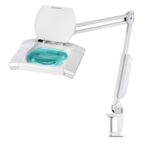 As we age, our eyes naturally lose some of their ability to focus close-in. A teenager can focus on objects as close as 3" but by age 50 that distance can increase to 18" - VERY frustrating when it limits your work or hobby. This premium-grade lamp is a simple and effective solution for seeing almost anything bigger, better and brighter. 36" triple-joint arm has unique internal cantilever system (not external springs like lesser lamps) that lets you adjust without loosening/tightening knobs - perfectly balanced to hold position (can be locked in position if necessary). Heavy-duty die-cast aluminum clamp with no-mark pad, nickel-plated steel screw fits surfaces to 2-1/2"-thick; easy to move remove and takes up just 2" of desk space. Extra-large 7.5" x 6.2" glass lens with 5-diopter (2.25X) magnification lets you see fine detail clearly but still has a practical focal range (distance of text or object from lens) of up to 7". Two 9-watt fluorescent daylight-spectrum bulbs illuminate work area without the heat build-up of incandescent or halogen. Bulbs have 5000-hr rated life inexpensive easy to replace. Conveniently-placed power switch on top of lamp head so it's easy to reach flip-up dust cover protects lens. Overall length 48", weight 11 lbs; 72" 18AWG UL-listed power cord.